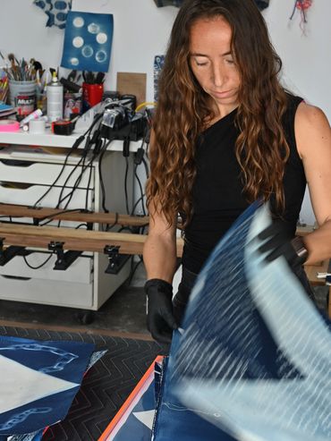 Gia: Yes! I did a residency this past summer in Tusa, which is a mountaintop village in Sicily and although I tried really hard to make work while I was there, I mostly just went up and down and up and down the mountain, driving my car, riding the bus, running on my own two feet. I got into a lot of trouble (snakes, farm dogs, flat tires, herds of animals, wildfires, et cetera) and, using my limited Italian, had to figure out how to get out of it. I fell in love, not only with the town, but also with the beautiful geometric abstraction of the Italian directional signs--which are different from ours in LA--and the wrecked, often layered, improvisational fences that do little to contain the wildlife or wild plants in the countryside. As I left (read: fled the wildfires), I started making cyanotype work that delves into the language of the road: construction fences, chains, ropes, and especially the wordless "universal" code of the directional signs, how they implicate and can abstract the body and bodies. I have personal narrative and symbolism woven into the pieces too. I'm deep into making the works right now and I'm so curious to see how it will all come out.